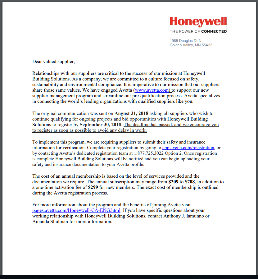 Please register with Avetta by the date below to ensure that your company is qualified for ongoing projects and bid opportunities with Honeywell. Once in the Avetta system, you’ll experience valuable benefits including access to 300 other Avetta clients.